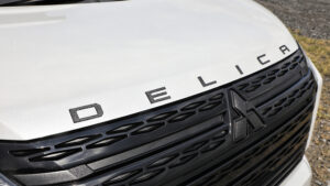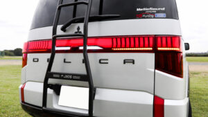 ボンネットフードとリアゲートにはブラックカラーの立体DELICAロゴエンブレムを装着。このエンブレムの装着だけでも引き締まった外観を演出する。