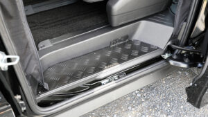 スライドドア左右のステップに取り付けるアルミチェッカープレート製のステップカバー。滑り止め加工が施され、ブラックとシルバーの2色をラインナップ。