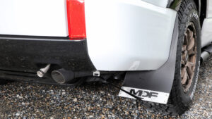 MDFオリジナルマッドフラップ。ブラック×シルバープレート、レッド×シルバープレート、ブラック×ブラックプレート、レッド×ブラックプレートを用意。