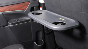 運転席と助手席の背面に装着可能な折りたたみ式となるパーソナルテーブルキット。2つのドリンクホルダーを備えるほか、折りたたみ時はフックが使用可能。