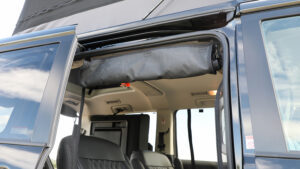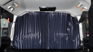 運転席と後部座席を仕切る遮光パーテーションカーテン。光を遮りプライベートを保護する。センター部の分割式で、使わない時は左右に固定する。