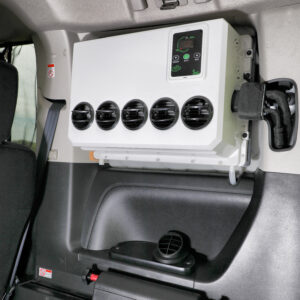 エンジンを掛けることなく冷房を使うことができる電動クーラーを2種類ラインナップ。クォーターウインドーの内側に装着するビルトインクーラーで、電源となるリチウムイオンバッテリーを床下に収納するタイプと、昨今流行のポータブルバッテリーを使用するタイプがある。猛暑下での子供やペットの休憩スペースとして、また車中泊時の快適な車内温度を保つものとして非常に有効なアイテム。エンジンを掛けずに使用できるFFヒーターの装着メニューも用意されている。