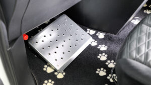 MDFオリジナルの運転席用フットレスト。パンチングによる滑り止め加工も施されており、左足で踏ん張ることができる。高さと角度調整が可能。
