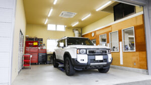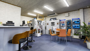 冷暖房完備のファクトリー。インストールは長時間に及ぶため、ファクトリー内の環境も仕上がりに直結する。ツールボックス内の工具が綺麗に整理されていることも、仕事のこだわりが見て取れる。