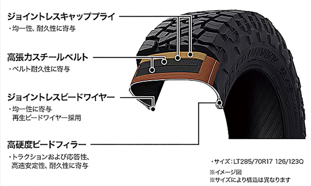 もうひとつの特長が、冒頭でも述べたとおり、再生ビードワイヤーといったサステナブル素材を使用し、環境に配慮していること。こうしたプラスアルファの要素で刷新された新作R/Tタイヤなのである。