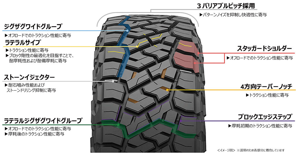 このタイヤはM/T(マッドテレーン)とA/T(オールテレーン)の中間に位置する双方のイイトコドリ的なタイヤである既存のR/T(ラギッドテレーン)をベースに進化させたもの。ポイントは4WD・SUVの足元を演出する迫力のあるサイドウォールデザインにある。また磨き上げたトレッドパターンによる高いトラクション性能のほか、ノイズ抑制による快適性も兼ね備えている。