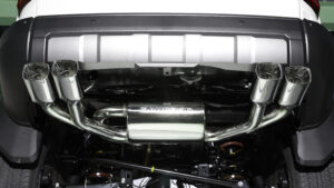 自社開発であることはもちろん、国内自社工場での一貫生産で優れた品質を確保しているガナドールのマフラー。PBS.Sを搭載した下写真のランクル250用のVertex 4WD/SUVマフラー(左右4本出し)は、光沢感のある質感と耐久性に優れたメカニカルなオールステンレス製。ランクル300で初採用された120×90という大型スクエアテールを250用にも踏襲し、ランドクルーザー250のリアビューに風格を与える。性能面だけでなく、スタイリング面でも圧倒的な迫力で満足させてくれる。もちろん、テールの出幅や取付位置は装着対象のバンパーの形状などに合わせて設定されている。