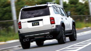 ここからは、見た目の迫力以上にパフォーマンスをアップできるランクル250用PBS.S搭載4本出しマフラー『バーテックス4WD/SUV』の実力をチェック!今回は250では力不足な印象もある2.7ℓガソリン車で〝比較〟試乗した。その内容はノーマルマフラーと4本出しのPBS.Sを搭載したマフラーをそれぞれ装着して、一般道と高速道路の同じルート約20㎞を走行するものだ。