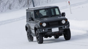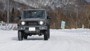 雪道へ向かうアスファルト路でのアタリは、ATタイヤと比較しても極端に柔らかい印象はない。ちろんハンドリングにもしっかり感があって、いい意味でスタッドレスタイヤを意識することはない。 いよいよ雪にイン。圧雪路での車体の安定性も高く、車重の軽いジムニーシエラでもしっかり路面を捉えてハンドルを切った方向へクルマを導くことができるし、ハンドリングへの応答性も◎。深雪でもコントロール感は良く、MTタイヤやATタイヤが泥を掻き出すような感覚に近い体感ができた。