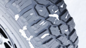 靴が完全に埋まるほどに雪が降り積もった深雪路では、MTタイヤやATタイヤのようにしっかり雪をかいてくれるため、面白いほどにジムニーはグイグイ前に進む。特に排雪性能が高く、トレッドに雪が詰まって横滑りを起こすこともない。少々荒い運転でもトラクションは逃げなかった。