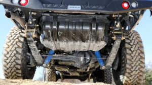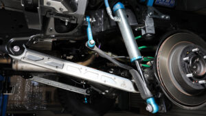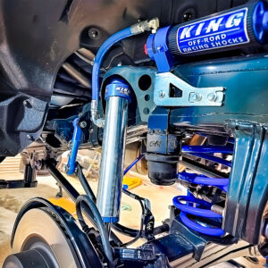 新井工房がリリースするSuperior Engineeringのサスペンションキットは減衰調整がないタイプを基本とし、これに最適な仕様を新井工房がセットして販売するスタイル。正しい装着さえ行なえばセッティングで悩む必要のないものとなる。それとは別に、サブタンク付きや3WAY調整式などもSuperior Engineeringはリリースしているため、現在GDJ70でハイアッパー仕様を開発中。Superior Engineeringの調整式&リザーブタンク付きダンパー、スーパーフレックスアーム、ドラッグリンク、モトレージのコイルスプリング、リーフスプリング、プロスタッフのシャックルにその他補正パーツを追加。ホイールはSOLIDRacingのTURBINE Z1の17インチに37×11.5R17のYOKOHAMA GEOLANDAR M/T G003。37インチという大径タイヤで、極力サスペンションの動きを規制しない開発を行なっている。これにより37インチ以下のタイヤサイズ装着がスムーズになる。現状は足の動きが良すぎるため、細部の干渉調整に奮闘中だ。