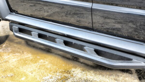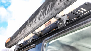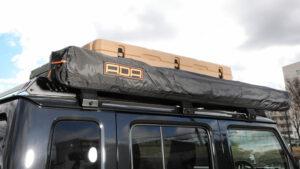 エクステリアはロックスライダー風デザインのA4Lサイドステップ、低床ルーフラックを装備。このルーフラックには、ワンオフステーで追加したADの270°展開サイドオーニング、ROAMのラギットケースを装備しており、これらも新井工房の取り扱い商品となっている。