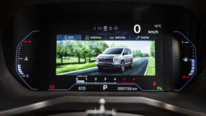 まず運転席に座って目に飛び込んでくるのは、インパネデザインの大幅な刷新だ。従来はオーソドックスな2眼式だったメーターは、8インチカラー液晶を用いたディスプレイメーターへと進化。台形モチーフのスピードメーター&タコメーターは視認性に優れ、先進性とプレミアム感も一段と高めている。このディスプレイには、ドライブモードの作動状況やアクティブヨーコントロール(AYC)の制御量など多彩な情報がグラフィカルに表示され、デリカD:5が誇る高い技術力をよりダイレクトに感じられるはずだ。