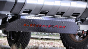 そのGOOSFAMでは現在、3インチアップと1.5インチアップの2台のランドクルーザー250をデモカーとして用意。3インチアップ仕様の注目は、やはり足回り。GOOSFAMオリジナルの3インチアップスタンダードプランが装着されており、これは補正パーツなどが全て揃ったキットとなっている。ラテラルダウンブラケットやデフダウンブラケット、フロントアッパーアームなども揃っている充実したキット内容で、ショックアブソーバーはUSブランドのFOXを使用する。このFOXダンパー、実はGOOSFAMとの共同開発のオリジナル仕様で、スタンダードプランでは調整無しタイプとなるが、リアがリザーブタンク付き&アジャスト機構付きのFOXダンパーを選択することもできる。
