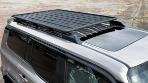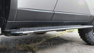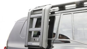 エクステリアでの注目はサイドラダーと電動サイドステップだ。サイドラダーはルーフラックとリンクして装着するもので、リアゲートの開閉に関係なく使用できる、実用性の高いアイテム。格納時はドアミラーの内側に収まる幅となるため、車検にも対応。格納時はキーロックも可能だ。電動サイドステップは、3インチアップの乗降性アップに寄与し、LED照明が夜間の足下もサポートする。