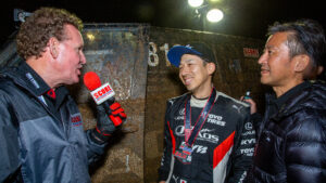 写真は丸1日以上におよぶBAJA1000を、ソロドライブで完走したTEAM JAOSドライバーの能戸知徳選手と、監督の赤星大二郎氏がインタビューを受ける模様。泥だらけのマシンが、その過酷さを物語っている。