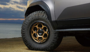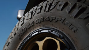 最大のポイントは37インチタイヤ「NITTO Ridge Grappler(ニットー・リッジグラップラー)」の装着。これはストリートでの快適性を確保しつつ、オフロードでは優れたトラクションを発揮するハイブリッドテレーンタイヤで、舗装路からダート、岩場まで幅広いフィールドに適応する万能モデル。そしてホイールにはKMCの人気モデルDirty Harryのマットブロンズをセレクト。武骨なデザインが足元を引き締め、車両全体の重厚感を際立たせていることが分かるだろう。