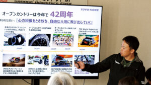ドリフト&サーキットシーンを席巻するプロクセスから四駆オーナーに人気のオープンカントリーまで、あらゆるオーナーやファンにカスタム&ドライブの楽しみを提供するTOYO TIRES。今回のイベントはブランド誕生から40年超のヒストリーを重ねる4WD・SUV用タイヤブランド『OPEN COUNTRY』が主役。昨今SNSでは〝#オプカン〟のハッシュタグがつくほどオプカンの愛称が定着し、老若男女問わず、このタイヤの虜になっているのだ。