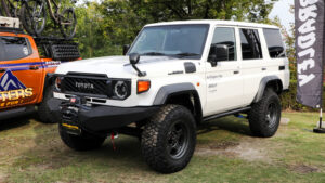 俺の#オプカン〜さなげ場所〜が開催されたSAFには、ダカールラリーで12連覇を遂げたオープンカントリーのタイヤを装着したTLCのランクル300、このラリーマシンのドライバーである三浦選手がXCRラリー参戦の際に乗ったK-oneのランクル250、さらに4×4エンジニアリングのランクル70、ショウワガレージのジムニーノマドなどの車両が展示された。