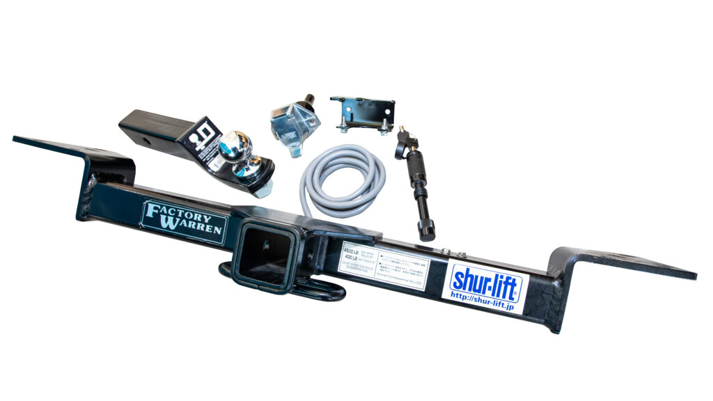 最大2,041kgの牽引を可能にするshur-liftのヒッチメンバー。高い信頼性に加え、付属品が豊富なことも大きな特長。ヒッチメンバーの差し込み口は一般的な2インチ角。これに装着できるボールマウント&ヒッチボールが備わり、それらの盗難を防止するヒッチロックピンも付属。またトレーラー等へ電源を供給する7芯配線ソケットおよびワイヤーハーネスも付く。shur-liftのヒッチメンバーは、牽引に必要な多くのアイテムが揃っているのだ。