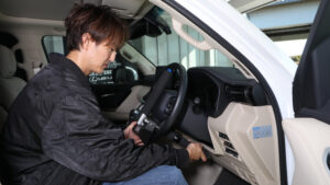 車検の検査員資格を有する整備士でもある相馬氏。メカニックとしての経験を生かし、デジタルおよびアナログのセキュリティシステムを高度な技術力でインストールする。