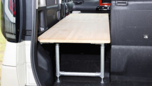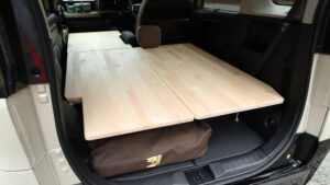 助手席側シートは倒せるが波打っているので、快適に就寝できるとは言い難い。そこで快適な就寝環境と収納能力を兼ね備えたのが、このベッドキット。サイズは1850×535㎜。天板素材は、地元静岡の高級ヒノキ材である天竜檜を使ったモデルと、ラジアタパイン材の2種類。