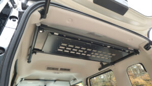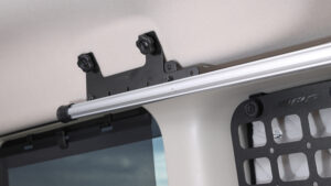 後席のアシストグリップにサイドステーを装着。さらにトレーを追加することで、頭上空間を有効に活用できる。トレーにはオプションのアイボルトが取り付け可能で、ランタンなどを吊り下げることもできる。自分の使い方に合わせたアレンジが楽しめるのも魅力だ。