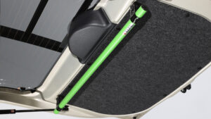 テールゲートの内側にパイプを装着することで、跳ね上げ式のテールゲート、開口時のゲート下を有効活用することができる。軽めの上着や着替え、タオル、ドライネットなど、アウトドア等で使用するちょっとした物の吊り下げができる便利アイテムだ。
