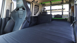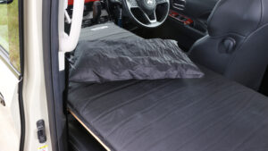 ベッドを装着しても後席が使用可能。シートとベッドの間に隙間が生まれるので、荷物や着替えなどの収納スペースも確保される。分解すれば荷室に収納できるサイズ感も秀逸。