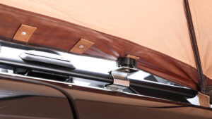三菱純正オプションのカーサイドタープ及びogawaカーサイドタープAL-Ⅱを、ルーフレールを使用して固定できるタープハンガー。ルーフレールの断面形状に合わせた設計なので、確実にタープを固定。一般的な吸盤での取り付け不安を解消する。ボルトピッチが1410㎜以内であれば、ハンガーをスライドすることで純正タープ以外にも使用可能だ。