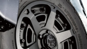 アーマーFFのコンセプトは無理なく無駄のないタフなスタイルを創ること。軍用車両で使用されたビードロックホイールを彷彿させるアーマーボルトは、まさにクリムソンの意匠。表面処理はミリタリー由来のショットガンブラックのカラーモデルと、6スポークのディスクデザインが浮かび上がるマットブラッククリアの2色をラインナップ。その仕様はディスク面とリム部分を鋳造し、圧力をかけながらスピニング加工を施して必要最低限の薄さまで引き延ばすフローフォーミング製法とすることで、アルミ素材の密度が上がり鍛造ホイールに迫るメタルフローを実現。これによりデザインの自由度と強靭な堅牢性を保つことが可能となり、鋳造と鍛造のメリットを両方取れる形となる。