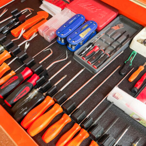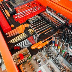 ランドクルーザー40から再々半の70、250、300まで、あらゆるランドクルーザーへのセキュリティインストールが可能なプラスオン。古いモデルには独自の配線やリレーを駆使して装着し、最新モデルはそれらに対応したテスターも使用しながら装着する。装着ツールも、デジタルからアナログまで豊富に揃えている。
