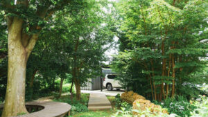 花や木が大好きでガーデニングも趣味のひとつという川嶋代表。そのため、店舗周辺の木々や草花はよく手入れが届いている。常にキレイな状態を保っていると、自然と治安も良くなる。袋小路の場所と相まって、プラスオンはセキュリティインストールに適した場所なのだ。