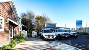 住宅街の奥側の袋小路に店舗が建つプラスオン。袋小路という場所柄、防犯性の高い場所であるため、安心してクルマを預けることができる。代車も豊富に用意されている。