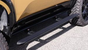 車高をアップすると、当然乗り降りはしにくくなってしまう。その問題を解決するには、サイドステップが欠かせない。ドアの開閉に合わせ自動で開閉するので、子供や奥様の乗り降りでは非常に重宝する。
