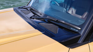 外観上で最も目を惹くのは、ノーマルよりもボリューム感を増したオーバーフェンダー。縦方向に厚みを持たせたことで、ノーマルよりも8㎜ワイド(車検対応)とは思えないほどボリューム感を増しているのが特徴。純正フェンダーのようなキャラクターラインが施されており、デモカーのように塗り分けることでイメージを一新できる。またフロントバンパー中央には大きなガードも追加しており、アグレッシブさをさらに強調させている。ボディパーツのほとんどはFRP製となるが、高級感を演出するのに欠かせないワイパーカウルだけはABS素材を使用しており、長年エアロパーツの製作で培ったノウハウが注ぎ込まれている。