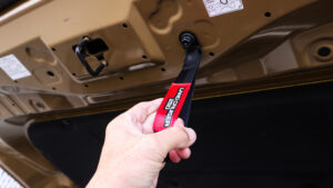 リフトアップすると、当然ボンネットの位置も高くなってしまう。そんな時に重宝するのが、このボンネットプルハンドル。レーシングカーのような雰囲気も演出可能。ハンドル部の色や文字の違いで6バリエーションを用意。