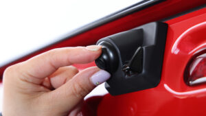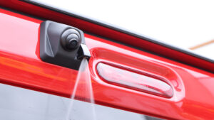 まず、後方用として用意されたのは「ハイマウントリアカメラキット」。その名の通り、高い位置に設置されるのが特徴のリアカメラだ。カメラはリアウォッシャーノズル部分に取り付けられ、車両後方を高い位置から見渡し確認しやすいのが魅力。もちろんウォッシャー機能も問題なく使用できる。専用設計なので取り付けがスマートで、後付け感がないのもこのパーツの良いところだろう。