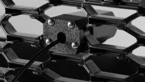 フロントカメラはナンバー下部などへの取り付けが一般的だが、オフロード走行を考えるとアプローチアングルを稼ぐために下部にパーツは装着したくない。そんなニーズに応えるのがジムニー用マルチVIEWフロントカメラ(ジムニーノマド (JC74W) R7.4〜)だ。ロアグリルのハニカム形状に取り付けるスマートなスタイルで、6種のビュー切り替えも備える多機能モデルだ。