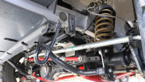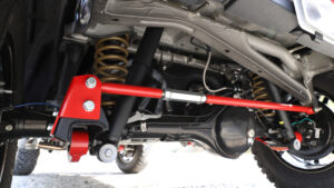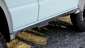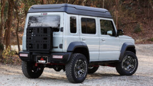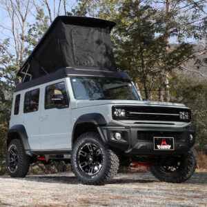 三木スズキのキットを装着し、ノーマルよりも3インチリフトアップを実施。ロングアームやキャスターの補正も実施しているので、ポップアップルーフを装着していても安定感は損なわない。デモカーには未装着だが、オリジナルビルシュタインも発売予定だ。