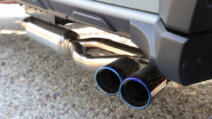 マフラーは柿本改のサイド出しをセット。PISTONのサイドシルパネルを装着しスマートさを強調。リアコンビはクリスタルアイをチョイスする。