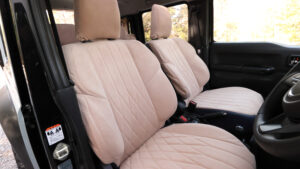 シートはスウェード生地を採用しつつ、バケット形状を強調させたシートカバーを装着。またシートバック部分にはクルーザーでよく見られるネイビーカラーを組み合わせ落ち着いた空間を実現。ラゲッジにはドロアーも装着し、収納性を向上させている。