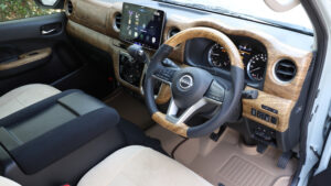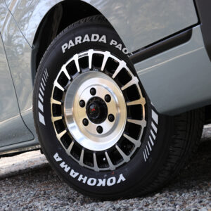 フロントマスクはフレックスドリームのFD-classicに変更し、艶消しウォルナット木目調インテリアセット&コンビステアリングをセット。ホイールはキャラバン/ハイエース専用のNOMAD/Dで、ボディ色はラングラーのアールをチョイス。