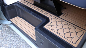 大きな開口部を設けることでテント部分へのアプローチも容易なだけでなく、悪天候でもアウトドアを満喫できる。長い車体のお陰で大人も快適に就寝可能だ。シートバックが座面にもなるので、セカンドシートの向きが転換可能。なお、ISO-FIX機構も備えているので、チャイルドシートも確実に固定できる。SeaDekのフロアマットを装着することで、プレジャーボートのような雰囲気を演出。色や柄も自由にアレンジできるのもポイントだ。