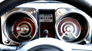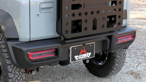 クラシカルなジムニーのフロントマスクを一変し、近未来的なスタイルを実現させるNEO VENTUREのフロントフェイスキットを装着。スクエアなヘッドランプだけでなく、グリル部分には長いデイライトを追加することで、ワイド感も演出する。東京オートサロンのようなカスタムカーのイベントではワンオプパーツを装着する車両が非常に多いが、こちらのフェイスキットはヘッドランプとグリルをセットにし、三木スズキから発売する予定。なおメーターはレトロアクティブの製品に変更し、細部に至るまで世界観の統一が図られている。