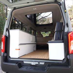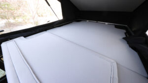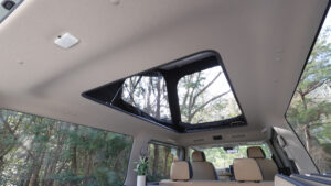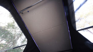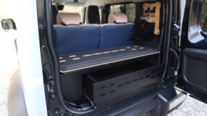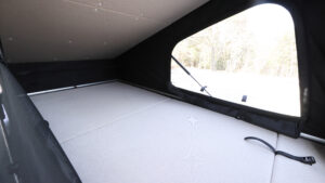 ルーフトップテントとの決定的な違いは、ルーフに開口部を設けることで車内からアクセスできるだけでなく、リビングスペースとしても活用可能。日中でもルーフトップを開ければ採光や換気はもちろん、頭上のゆとりが生まれている。ちなみにフロア部分にはクルーザーのデッキに採用されるSeaDekを装着。一般的なウッドパネルとは異なり、温もりのある心地よい居住性を実現している。