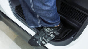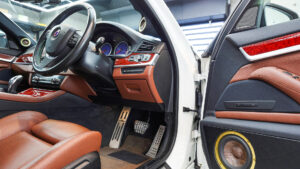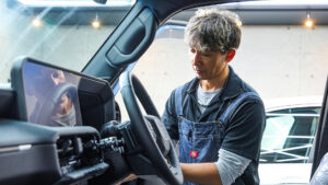 インストール中、車内に入る際には靴を脱いでいる。クルマを預けてくれるオーナーの信頼に、最大限に応えようとする大塚さんの姿勢がこうした気遣いに見て取れる。