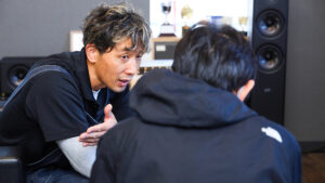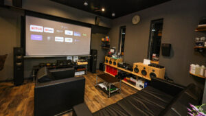 店内のレイアウトは、代表の大塚さん自ら理想のショップをイメージしてデザイン。商談スペース兼リスニングスペースにもなるウェイティングルームはホームシアターを備え、作業の待ち時間にはオンラインの動画などを高音質で試聴することが可能となっている。