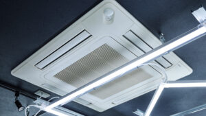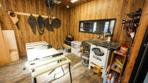インストーラー歴30年の大塚さんのこだわりである作業環境。快適な環境を作ることで天候を問わず確実な作業ができるからだ。そのため施工ブースにも業務用のエアコンを設置。