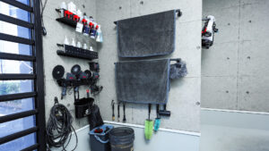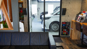 施工ブースはシャッターを備え、預かったクルマは室内で保管・作業するため防犯上も安心。コーティング作業では埃が大敵となるが、外気が入らないので最高の状態で施工することができる。